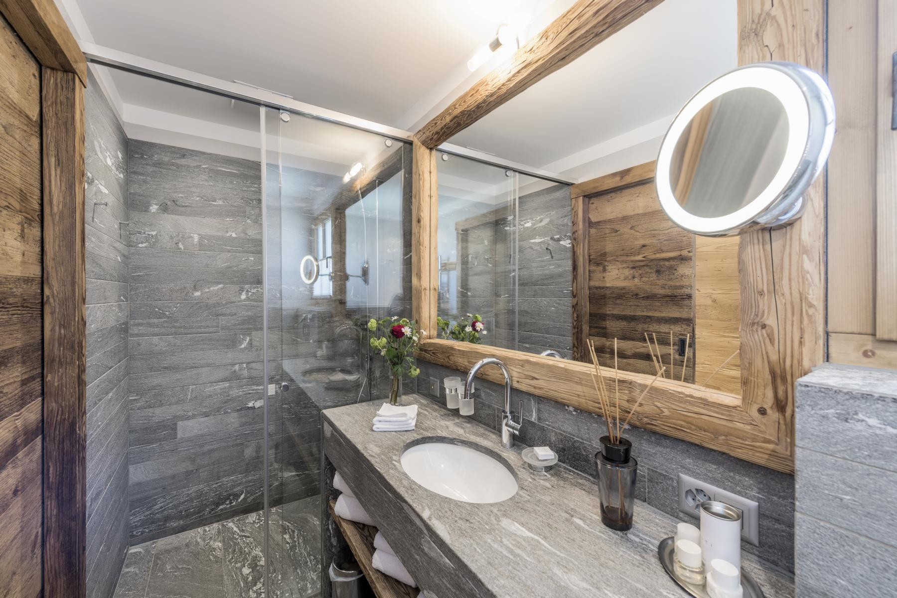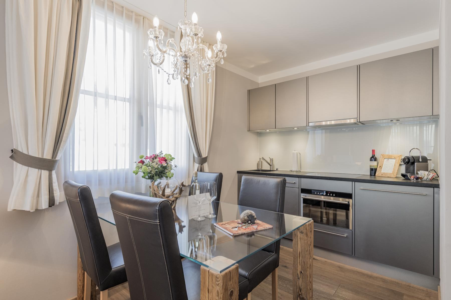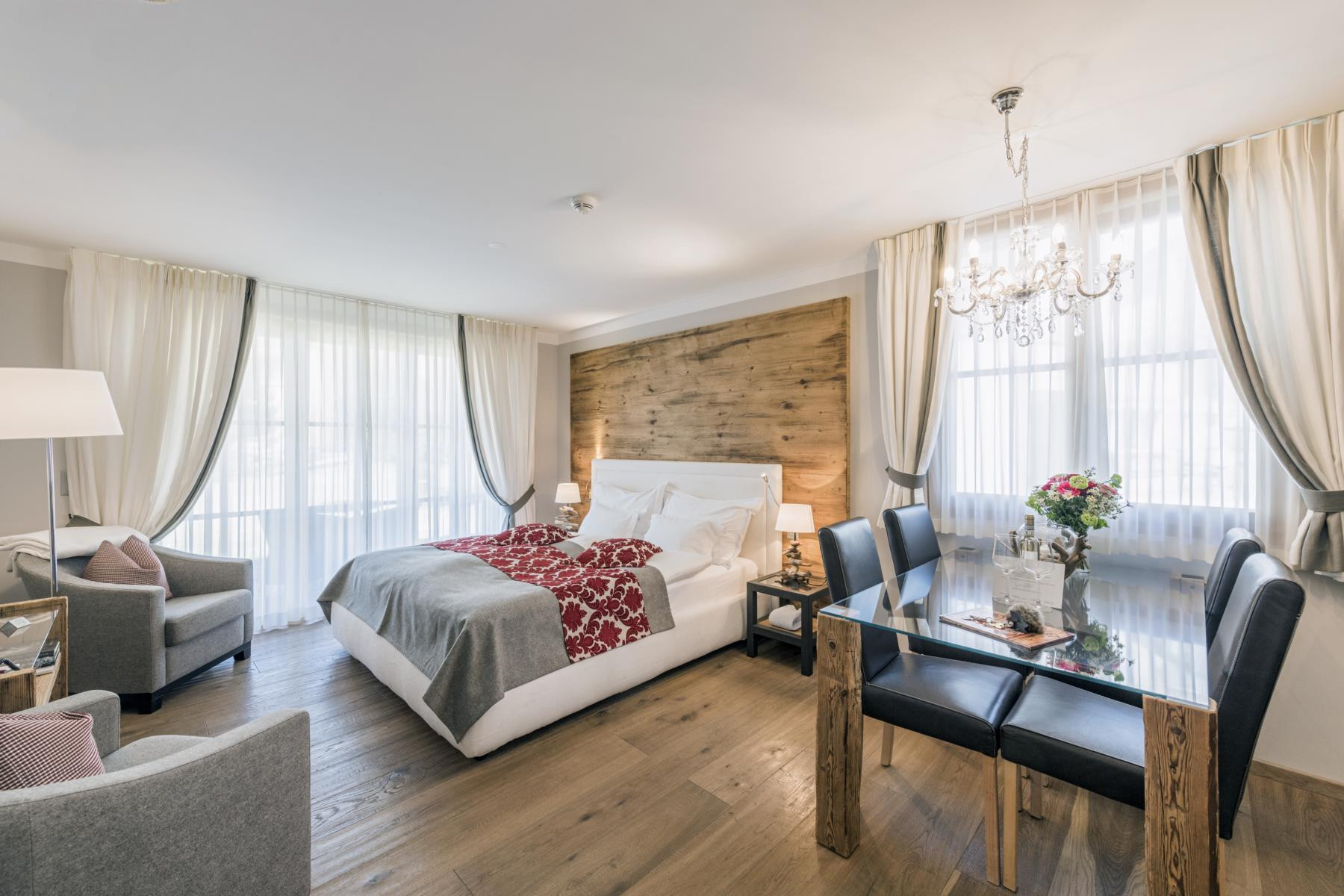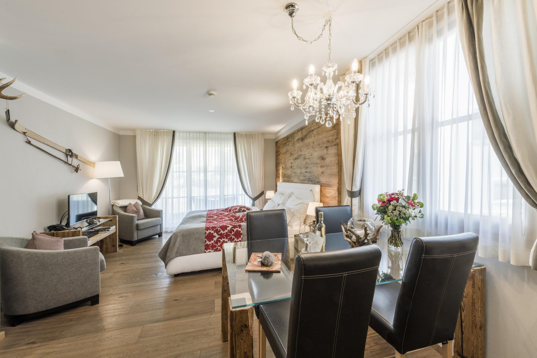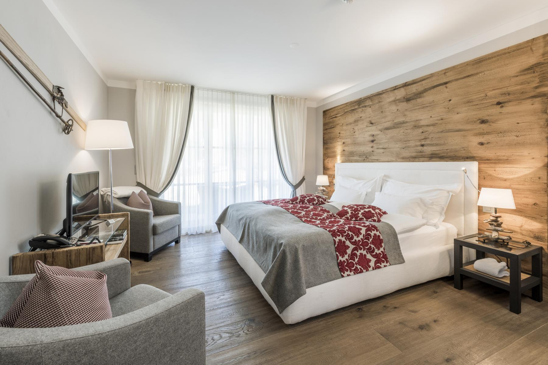 Das Zimmer ist im modernen Chalet bzw. Bergstil ausgebaut und verfügt über 1 Bad mit Naturstein, Dusche, WC und Haarfön, kleiner Küche mit Spül- und Kaffeemaschine, einem Sitzplatz, Safe, Telefon, TV und kostenlosen Wireless-Zugang sowie Gartensitzplatz. Das Zimmer kann auf Wunsch mit einem weiteren Doppelzimmer verbunden werden.